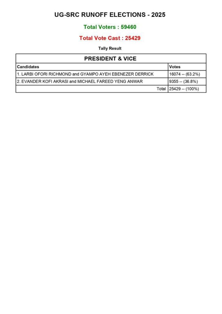According to official figures released by the SRC Electoral Commission, Richmond and Gyampo secured a commanding 16,074 votes out of 25,429 valid ballots cast, representing 63.2%. Their closest contenders, Evander Kofi Akrasi and Michael Fareed Yeng Anwar, polled 9,355 votes (36.8%).