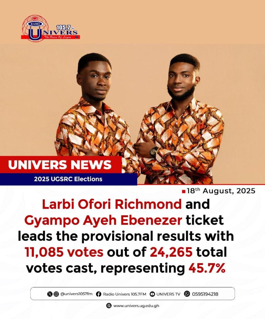 Accra – University of Ghana – The Electoral Commission of the University of Ghana Student Representative Council (UGSRC) has released the provisional results for the 2025 SRC Elections, with two candidates making an early lead but failing to secure an outright majority.