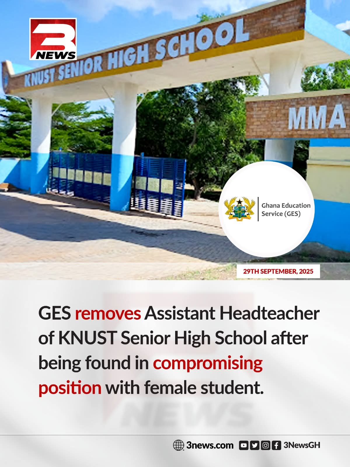 the Ghana Education Service (GES) has dismissed the Assistant Headteacher of the Kwame Nkrumah University of Science and Technology Senior High School (KNUST SHS) following allegations of professional misconduct.