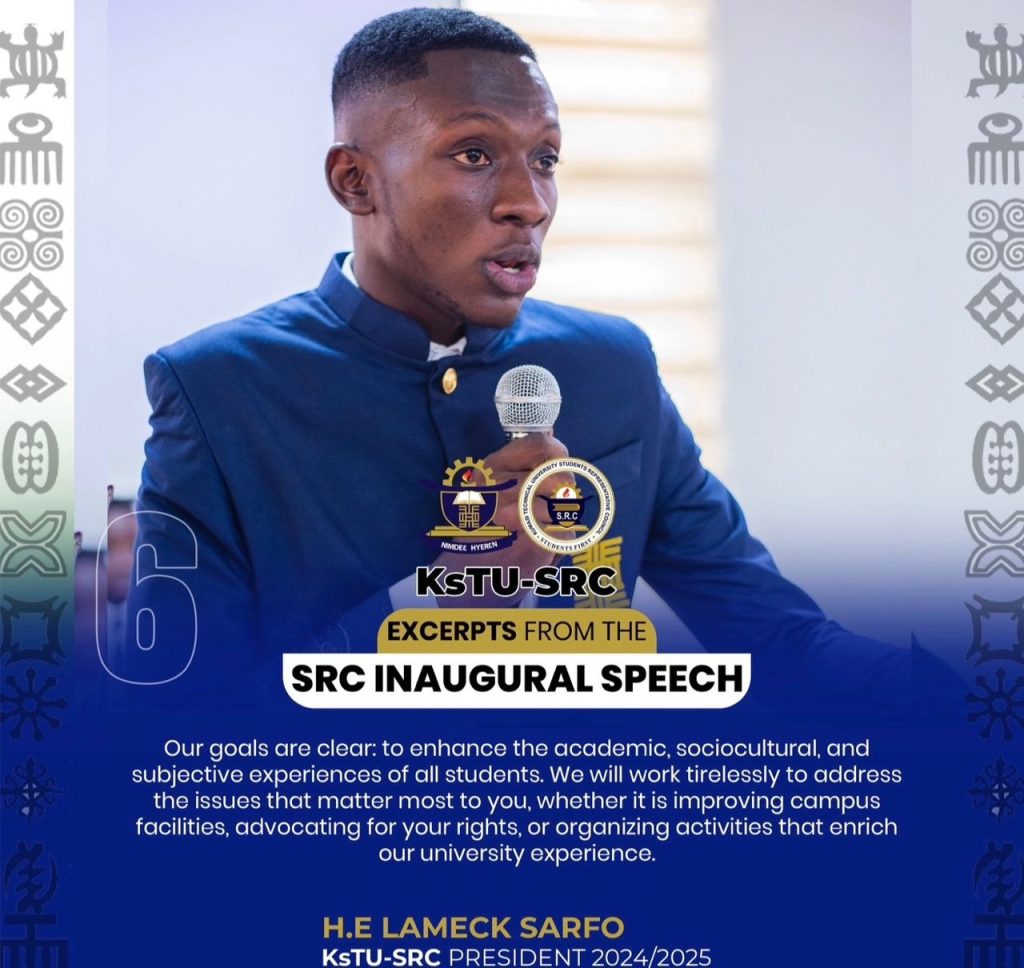 Kumasi Technical University (KsTU) has sworn in its new Student Representative Council (SRC) executives, with H.E. Lameck Sarfo taking the oath as the SRC President for the 2024/2025 academic year. The inauguration ceremony included the swearing-in of new parliamentary and SRC executives by the Judicial Committee (JC), following the dissolution of the outgoing parliamentary council.