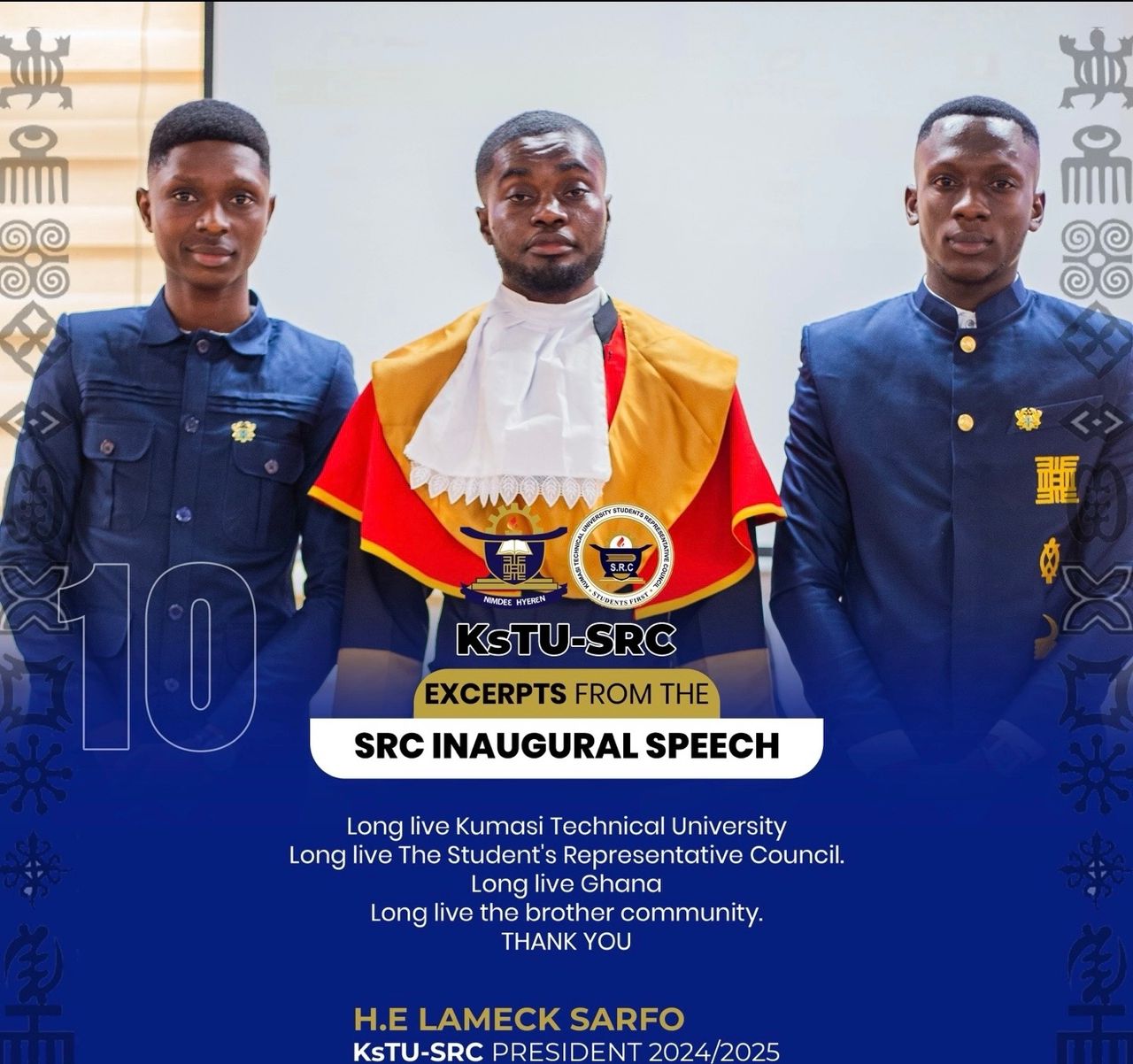 Kumasi Technical University (KsTU) has sworn in its new Student Representative Council (SRC) executives, with H.E. Lameck Sarfo taking the oath as the SRC President for the 2024/2025 academic year. The inauguration ceremony included the swearing-in of new parliamentary and SRC executives by the Judicial Committee (JC), following the dissolution of the outgoing parliamentary council.