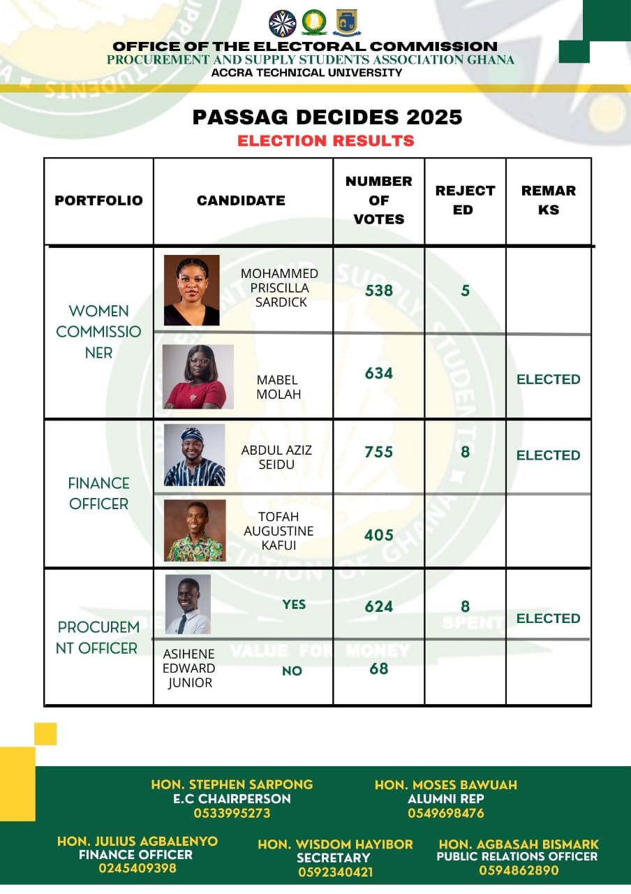 The Procurement and Supply Chain Management Department of Accra Technical University has successfully concluded its departmental elections with an impressive 1,173 students casting their votes, according to Stephen Sarpong, the Electoral Commission (E.C) Chairperson.